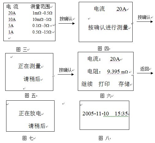 如圖三所示,按“↑、↓”鍵移動,按“確認”鍵顯示圖四,按“確認”鍵測量,按“返回”重新選擇電流。測量數(shù)據(jù)如圖六,數(shù)據(jù)穩(wěn)定后將鎖定并閃爍,選擇 “繼續(xù)”項將重新刷新數(shù)據(jù)即對同一點重新繼續(xù)測量;選擇“打印”項,把當前數(shù)據(jù)打印出來;選擇“存儲”項,將當前數(shù)據(jù)及日期保存起來;按“返回”鍵將放電如圖七并有蜂鳴聲,放電完畢后,蜂鳴器聲停止;重新進入畫面三,按“返回”鍵返回主菜單圖二。