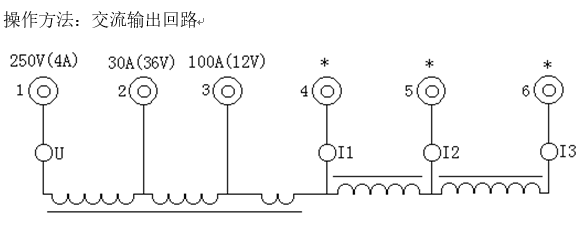 ⑵交流電流0~30A(36V)輸出時,從2與4端子之間輸出,此時顯示選擇應(yīng)切至“I1”指示燈亮,當(dāng)輸出電流超出40A時,儀器內(nèi)部將自動切斷輸出。且內(nèi)部告警,延時約10秒后將自動恢復(fù)輸出。
